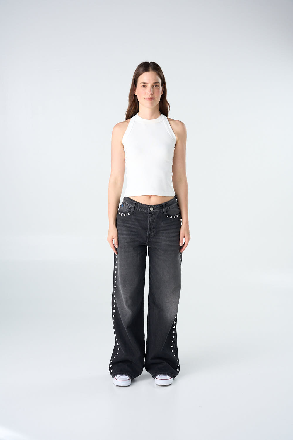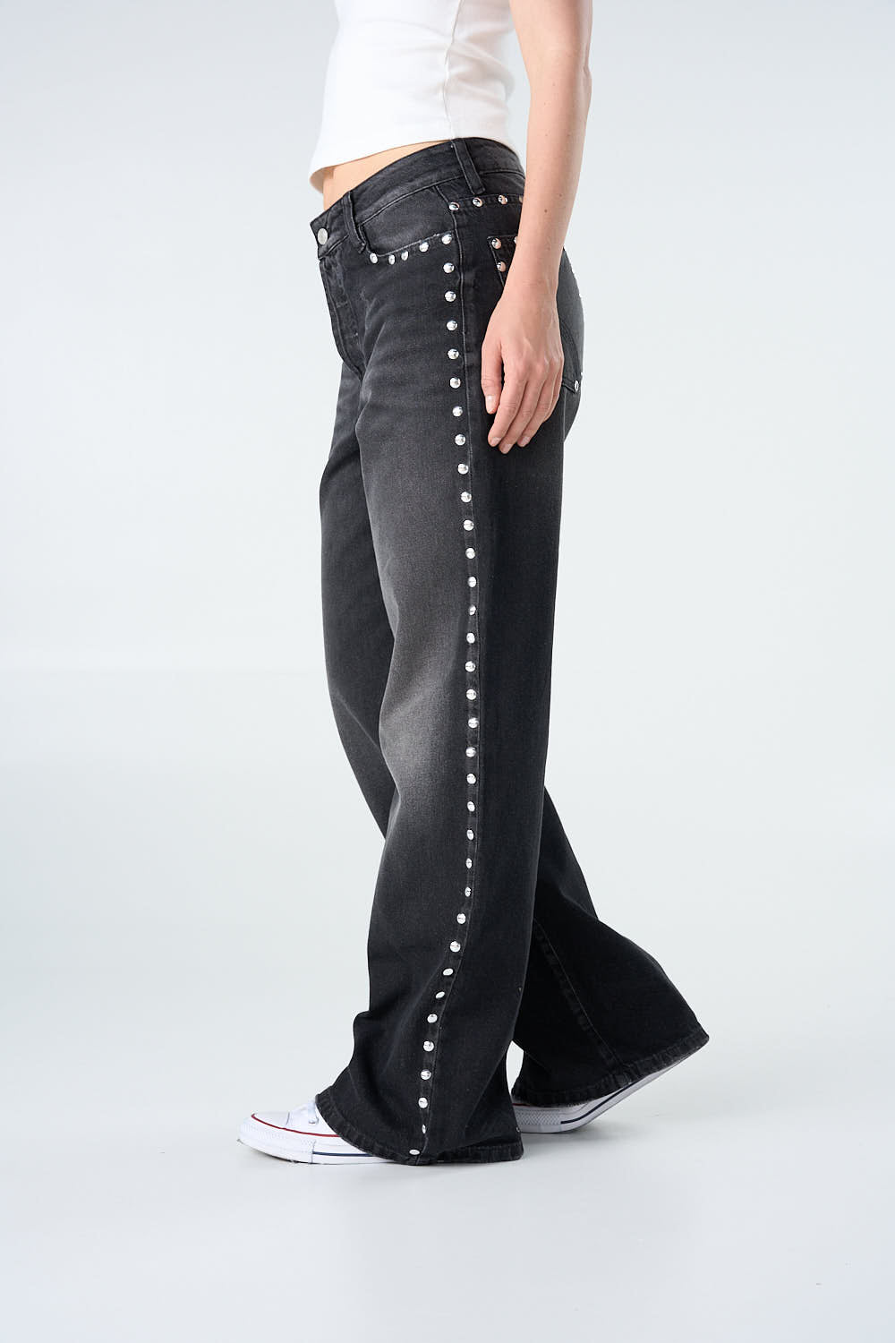 Black flare jeans with shiny silver studs. Button closure. 100% cotton.