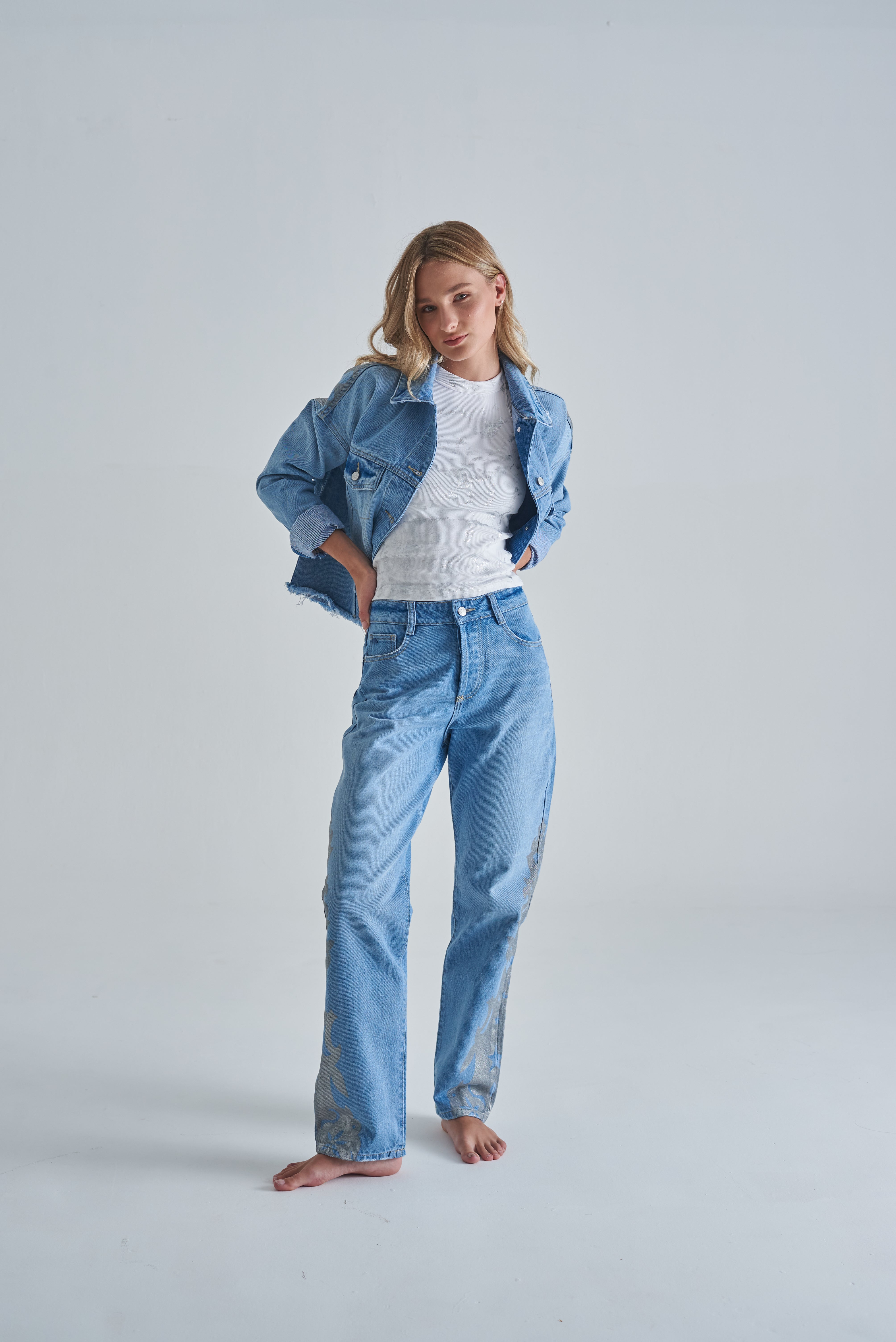 Cropped oversized jacket, medium denim tone with silver western print. Composition: 100% cotton, closure method with buttons.
